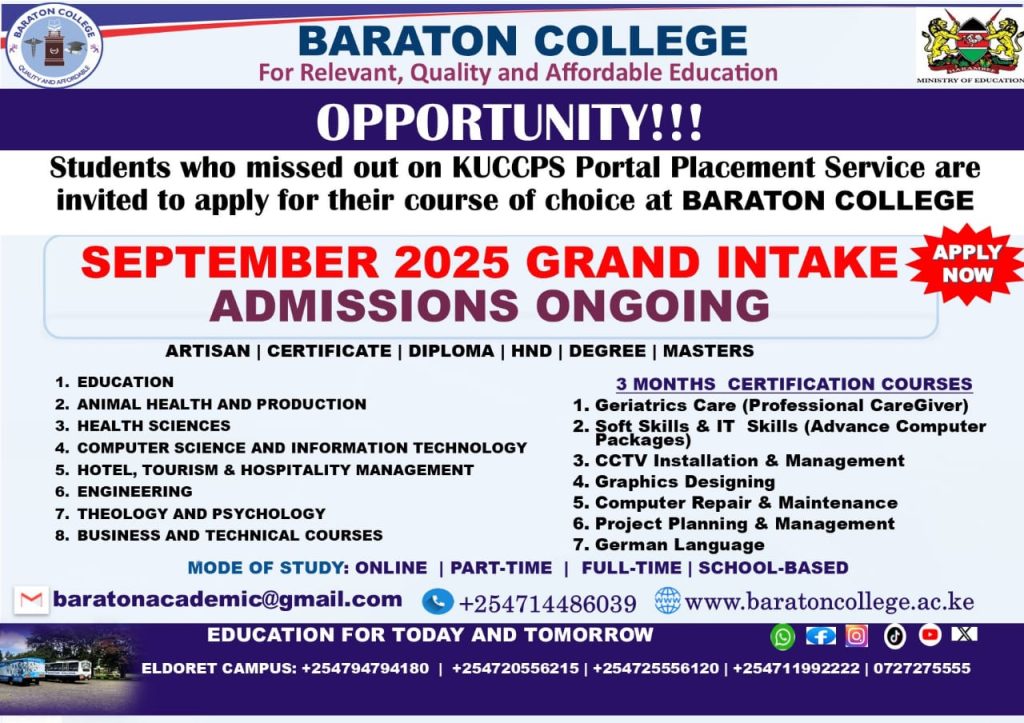 The Director, Principal, Staff, Parents and Students of BARATON COLLEGE wishes to invite all Parents, Sponsors,Graduands, Students and Guests to the upcoming 10th Graduation Ceremony to be held on 29th November 2024 starting from 9:00 am at Baraton College, Eldoret Campus , Read More …